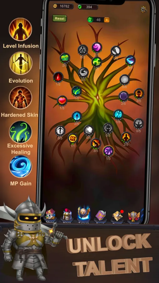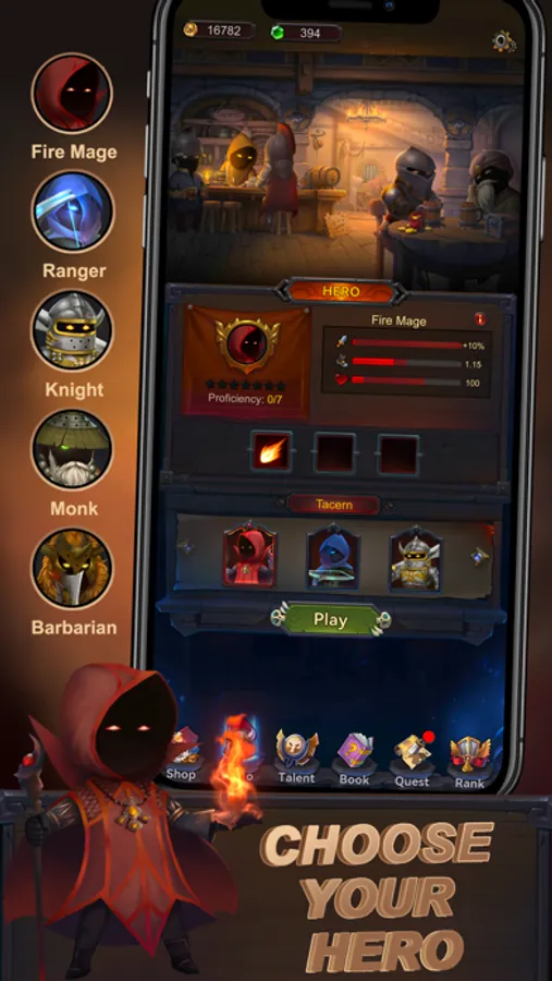 • Five heroes to choose from: Ranger, Fire Mage, Knight, Monk, Barbarian. Each of them has three different initial skills.