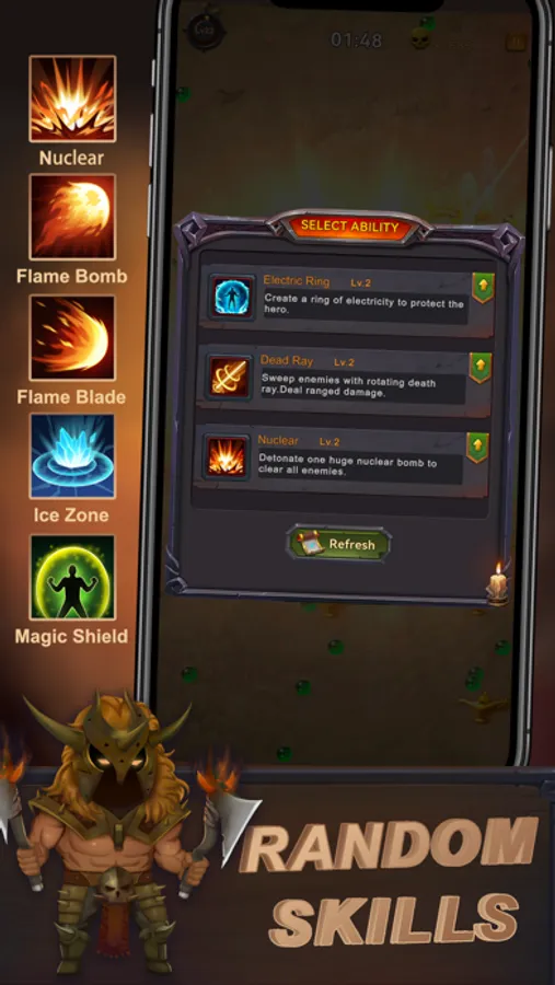 • Get one skill from the three random skills each time you upgrade. Choose the right one you think.