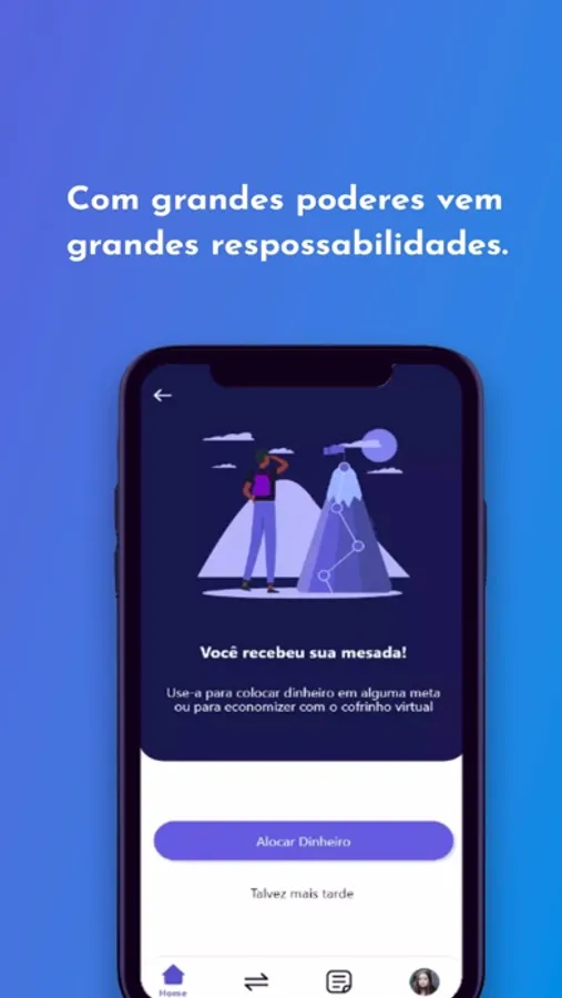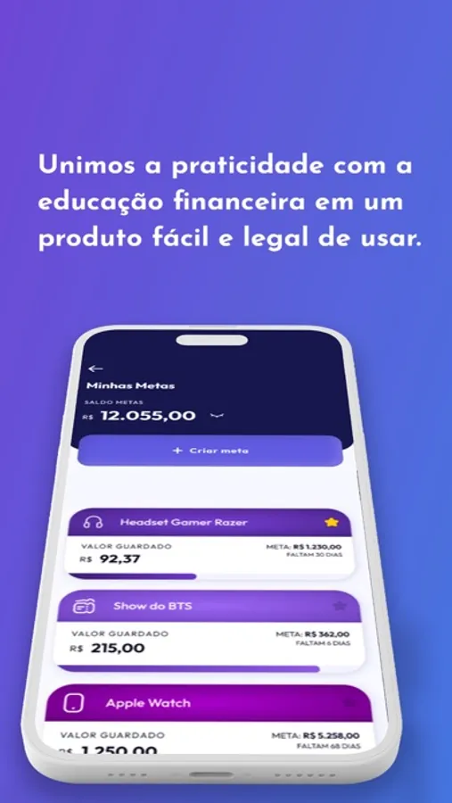Por meio de diversas ferramentas, unimos a praticidade com a educação financeira em um produto fácil e legal de usar, que engloba todos os serviços financeiros que os jovens atuais poderiam desejar! Junto com um cartão de crédito (pré-pago), você recebe acesso ao nosso app, onde pode regular sua conta e gerenciar seus gastos e poupanças através de incríveis funcionalidades (listadas abaixo!). Além disso, os pais dos usários tem acesso a sua própria interface do aplicativo, onde poderão supervisionar todas as atividades dos seus filhos e configurar as funcionalidades como bem quiser, e tudo isso por apenas R$9,99 mensais!*