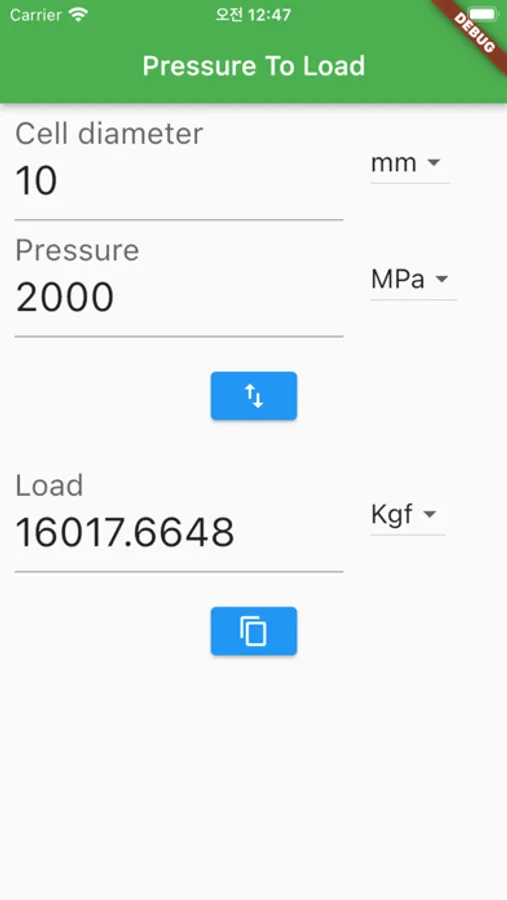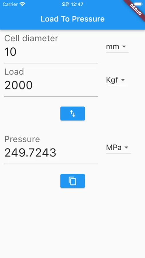 셀에 하중을 가할 때, 인가되는 하중과 셀의 직경을 바탕으로 압력으로 환산해주는 계산기