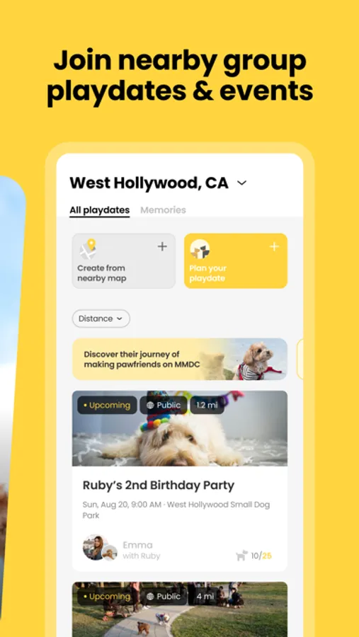Ready to host a dog meetup or puppy playdate? Use MMDC's advanced map to see nearby dogs and ideal playdate spots. Set a time and place, invite local pet parents, and let the fun begin! After the playdate, share a 'Playdate Memory' to capture the adventure and inspire others. Watch your dog’s social life soar as you build a collection of shared experiences.