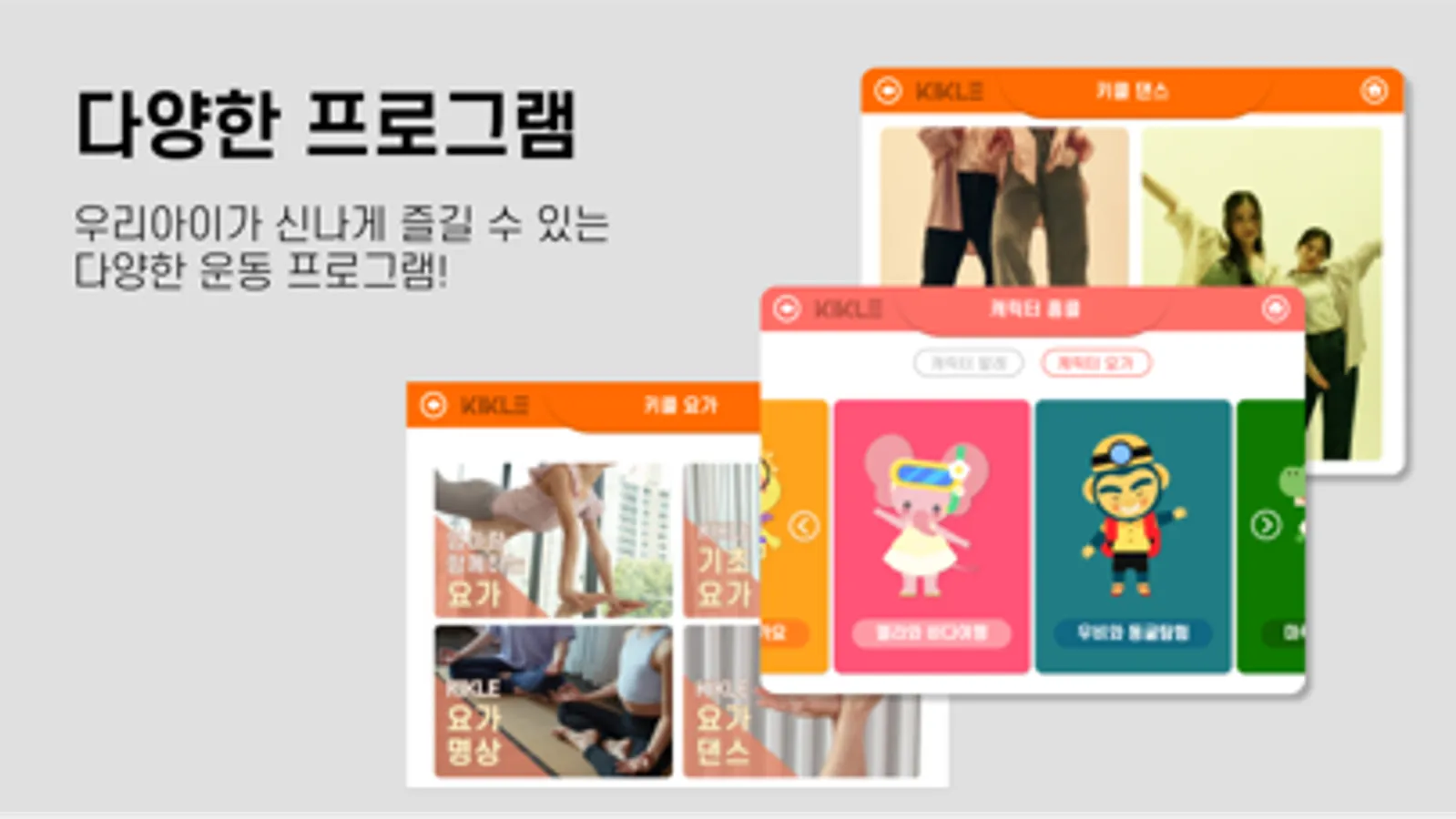 키클(키즈클래스)에서 요가,발레,방송댄스 등 다양한 홈트레이닝 서비스를 체험해보세요. 바디 트레킹을 이용한 캐릭터 변신을 통해 재밌게 운동하고 태블릿으로 실시간 선생님과 화상수업을 할수 있습니다.