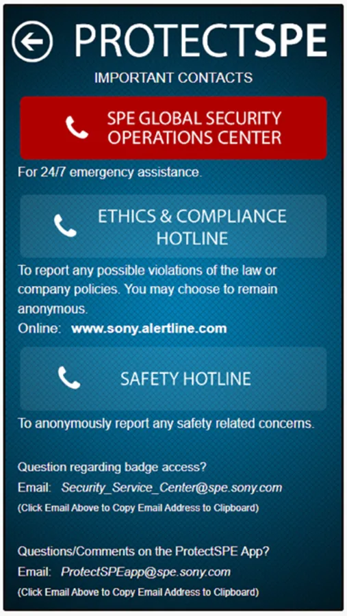The ProtectSPE application empowers Sony Pictures Entertainment employees, partners and visitors to quickly access information about emergency procedures, contacts and other useful safety related details.