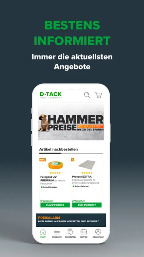 Die App von D-TACK ist ein Muss für jeden Handwerker, denn so einfach war die Beschaffung von Verbrauchsmaterial und Werkzeug noch nie. Mit der App von D-TACK optimieren Sie Ihre Materialbeschaffung dank folgenden Features: