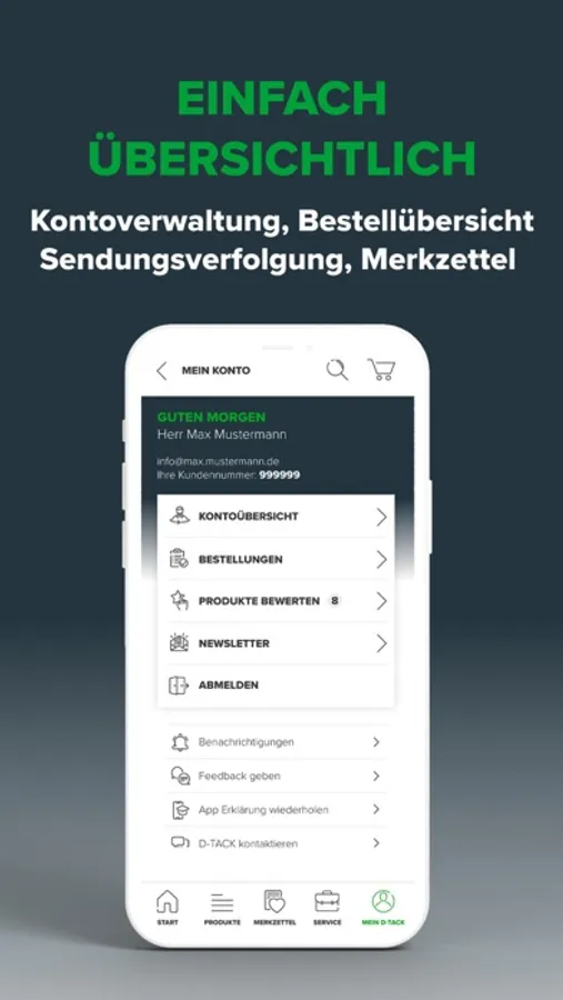Nach der ersten Anmeldung in der App von D-TACK sind Sie bei allen darauffolgenden Aufrufen der App automatisch angemeldet. So können Sie ganz bequem und schnell von überall bestellen, auch wenn Sie Ihr Passwort gerade nicht parat haben.