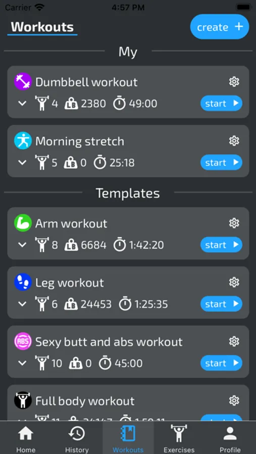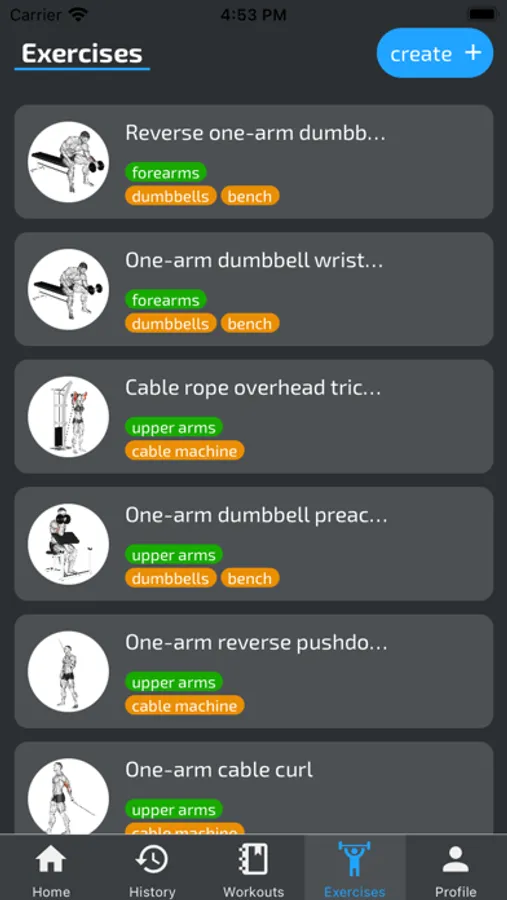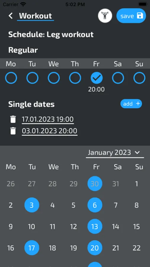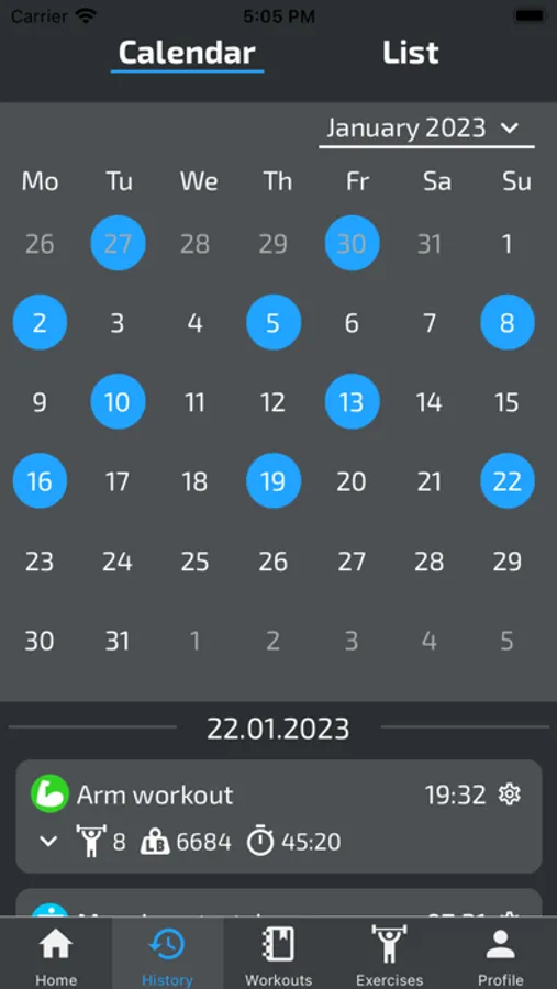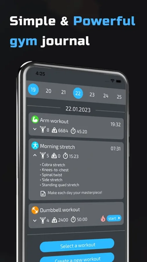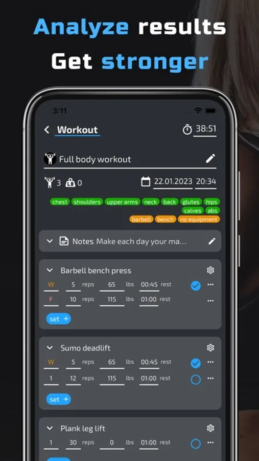 Mark completed sets and lifted weights. Analyze your history and statistics.