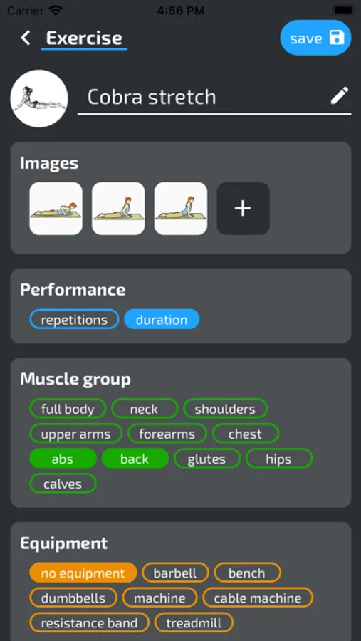 * Access to an expandable database for various muscle groups, gym machines and equipment