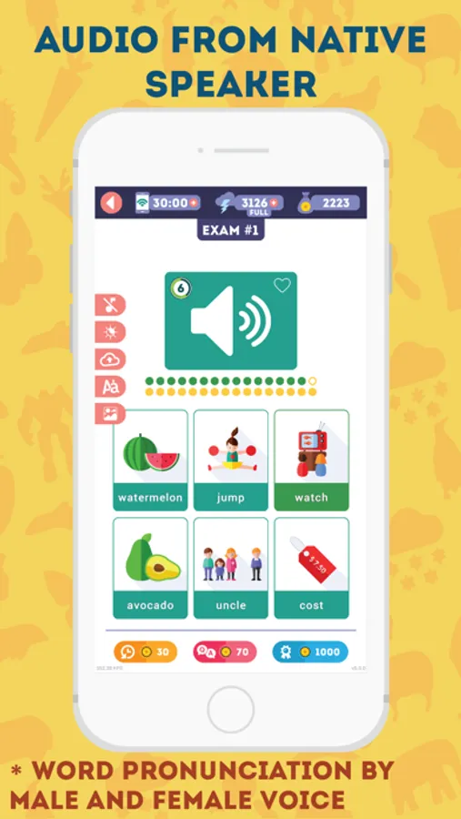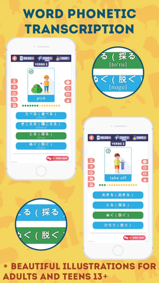 Do not need to know how to read - If you cannot read yet, no problem! Each word has a transcription in your language! And for more experienced ones, in the settings, you can choose a phonetic (like in a dictionary) transcription.