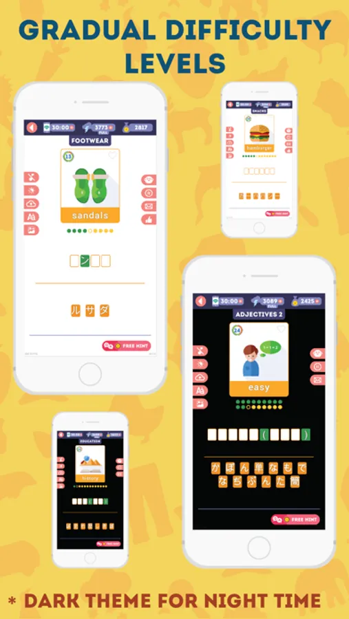 Dynamic lesson difficulty - The app changes lesson difficulty gradually as you progress. To achieve this, it keeps stats for EVERY word! Example: in the spelling mode, initially you need to insert several missing letters in a word, then create a word having extra letters and finally, when you are ready, you will need to type the entire word on the keyboard.