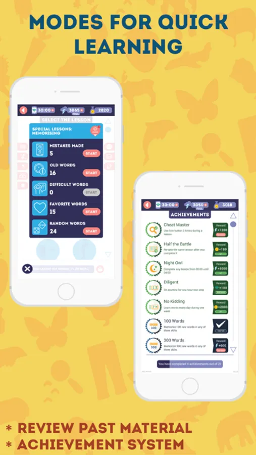 Modes for quick learning - The App includes four additional lesson types which are made of Favorites, Difficult, Old, Random words. You can add any word to your favorites and later create custom lesson from your Favorite words. Words are automatically added to "Difficult" (the ones you struggle to memorize) and "Old" (which you have not reviewed for a long time) sections. A "Random" mode will create a unique lesson.