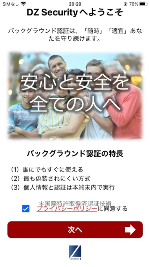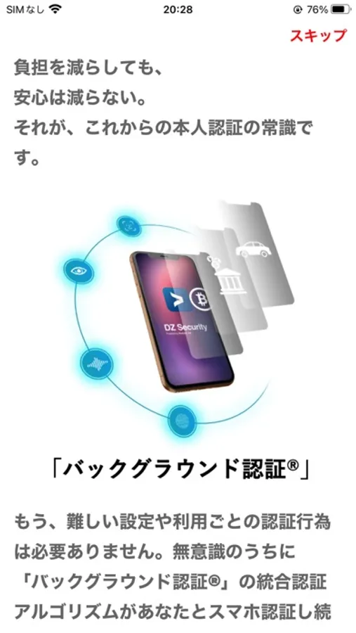 「DZ認証(=バックグラウンド認証®)」という特許技術からなる「DZ Security®」を搭載しているため、アプリ利用中(バックグラウンド)に複数の要素で適宜ユーザーの様々な情報を総合的に判断しながらユーザーを守り続けます(独自のAI認証アルゴリズム)。