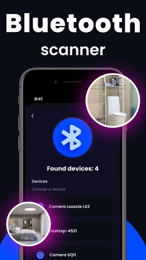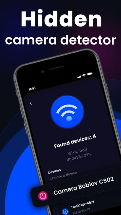 Hidden Camera - Spy Detector is a scanner app that discovers linked network devices. Discovers all the devices connected to your WiFi. The application also scans the Bluetooth network. Shows the distance to Bluetooth devices.