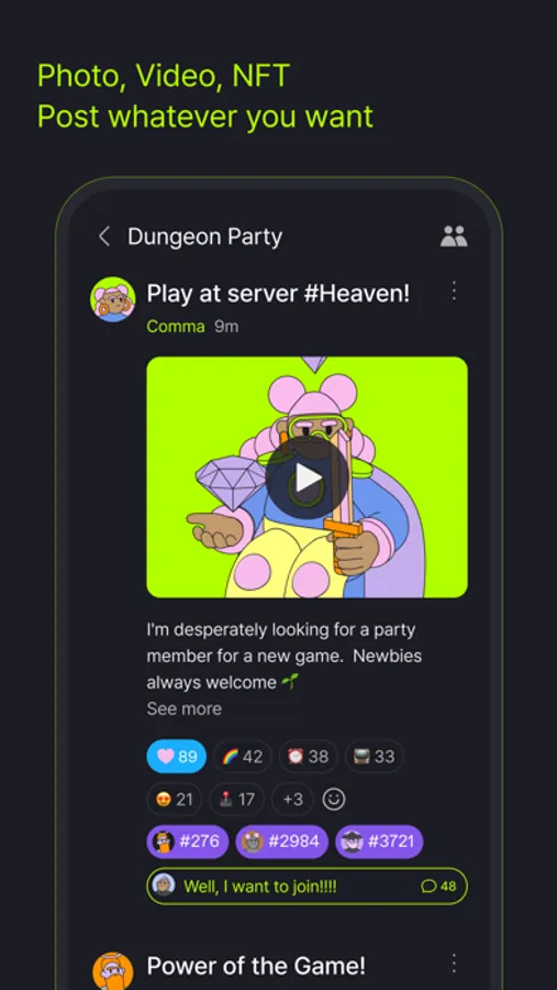 - Play with NFTs. You can set your profile with NFTs or post them. You can also explore NFTs owned by other members.