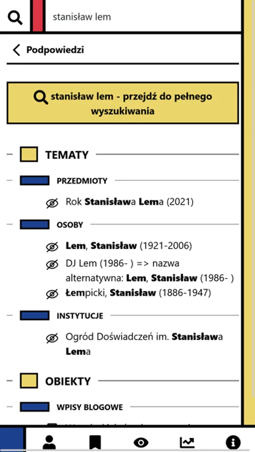 Aplikacja umożliwia także przeszukiwanie wszystkich dostępnych w niej zasobów oraz przejście do systemów źródłowych (np. tekstów wpisów blogowych).