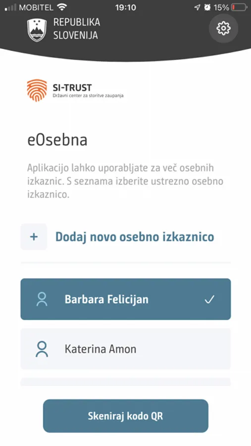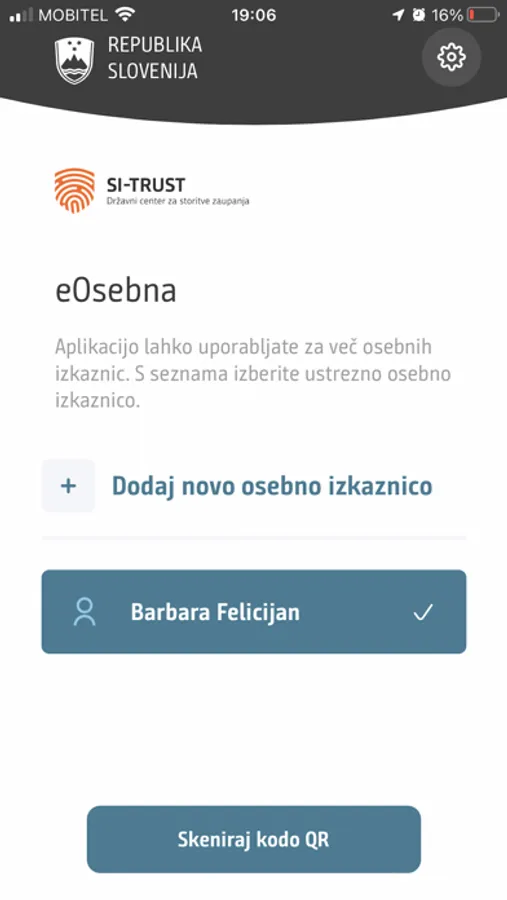 Ko imate mobilno aplikacijo eOsebna nameščeno na svoji mobilni napravi, se lahko prijavite v katerokoli storitev prek SI-PASS, kjer izberete način prijave z elektronsko osebno izkaznico in mobilno aplikacijo. S slikanjem kode QR se lahko prijavite tudi v drugi napravi, npr. na osebnem računalniku, ne da bi morali karkoli dodatno nameščati ali prilagajati.