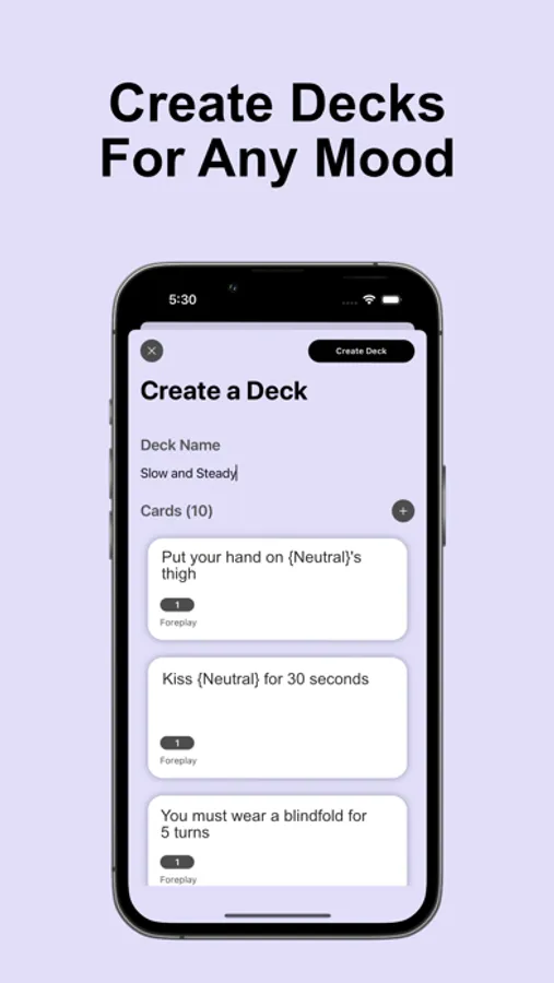 Take your adult life to the next level with our custom deck feature. Combine your favorite prompts to make a game that will pleasure both you and your partner/s. You can also craft your own experience by creating your own prompts*. The possibilities are endless with our frequently updated prompts and prompt packs.