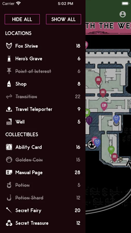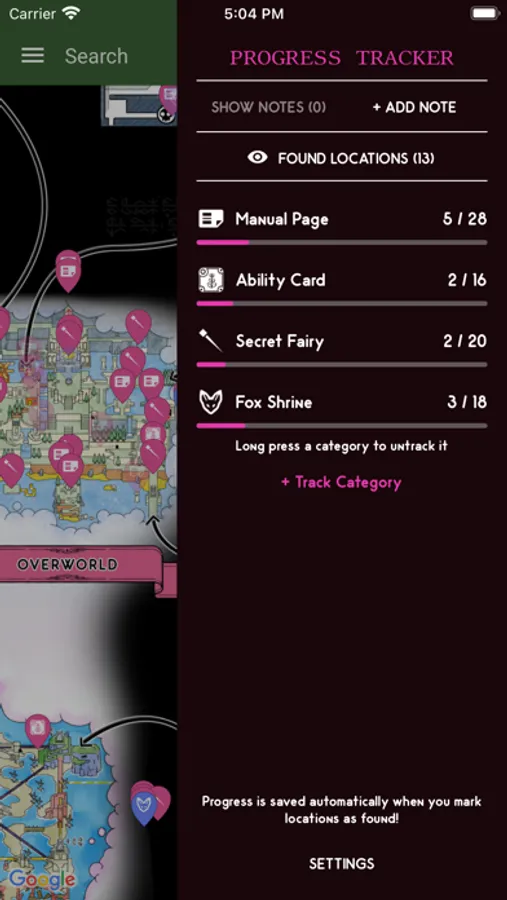 • Progress Tracker - mark locations as found and track the progress of your collectables.