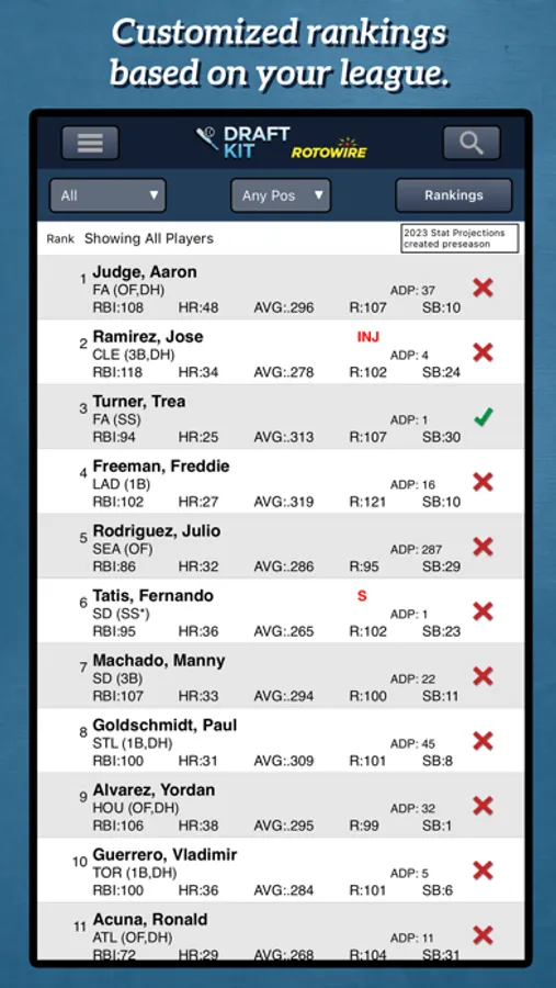 Simply enter your league's scoring and roster settings and the app creates rankings from a value-based calculation that uses RotoWire's 2023 stat projections. Here are some of the features: