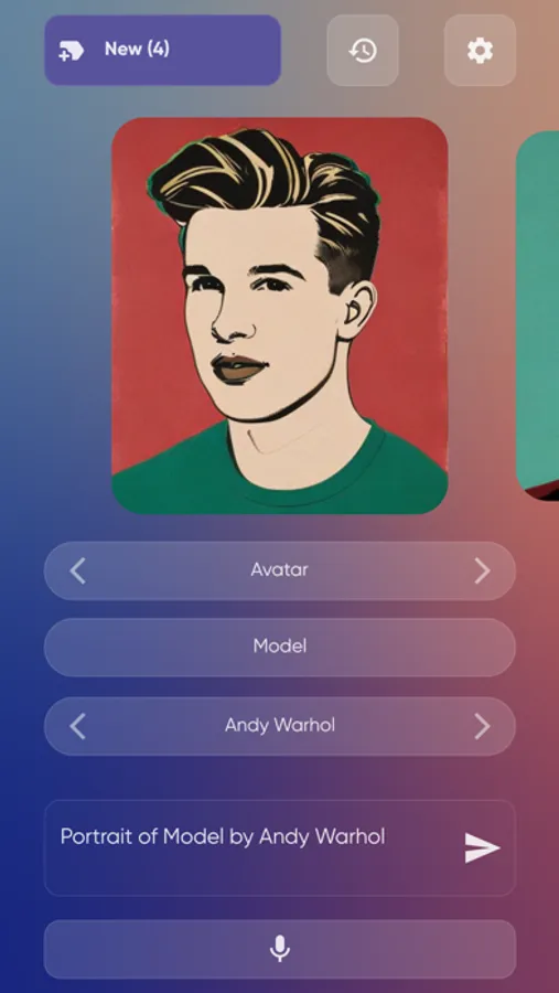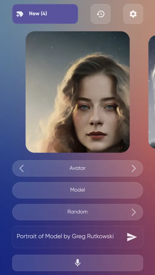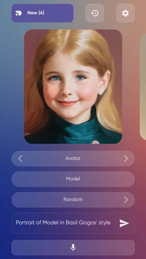 After the neural network prepares a personal AI model based on the user's photos, the user has the opportunity to generate individual avatar in the style of favorite artist or by any personal textual description. To do this, the user should select desired model in the slider, then select the artist he likes and send the request for generation. After some time, the user will receive 4 interesting and unique avatars. Generation of avatars can be done unlimited number of times without fee.