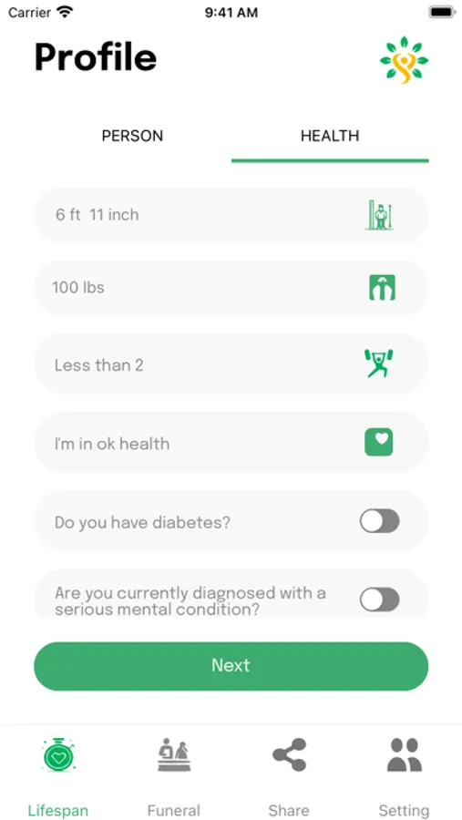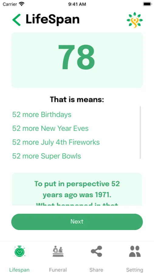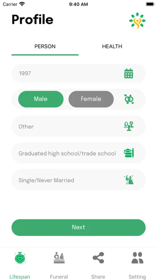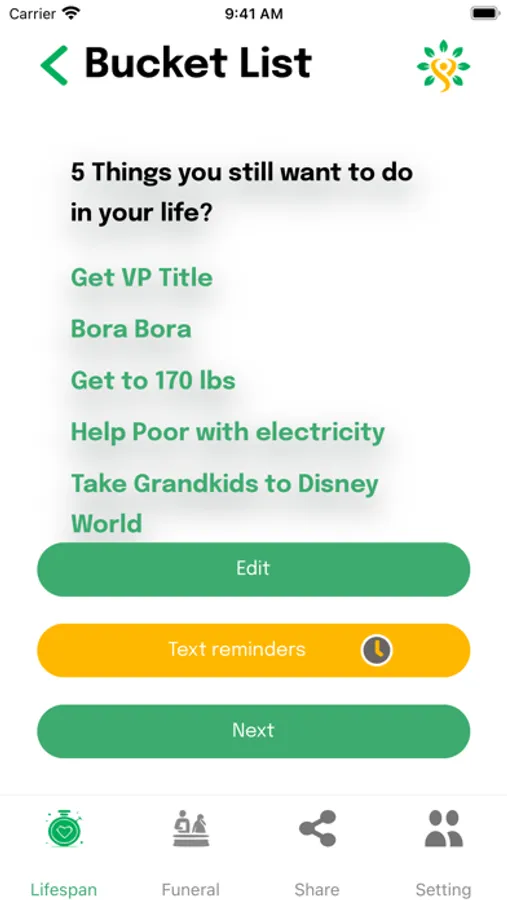 Determines your life expectancy and helps you formulate your bucket list with your remaining years. Plan your funeral and outline how you want to be remembered with photos, music, and videos.