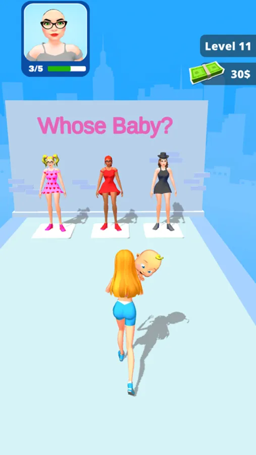 Whose baby? Collect money and buy hints to find the parents of the baby.