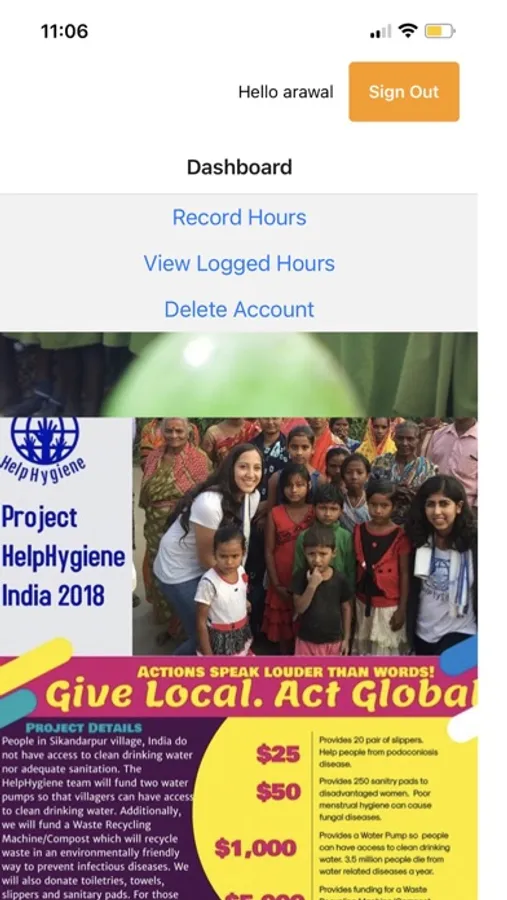 This app is for the Help Hygiene non-profit organization which is dedicated to increasing sanitation in impoverished communities. Volunteers within the organization can log their volunteering hours as they fundraise, host drives, and more. The volunteering data is then sent to the founders of Help Hygiene who can easily manage the data and give appropriate credit. This app was created by Arjun Rawal.