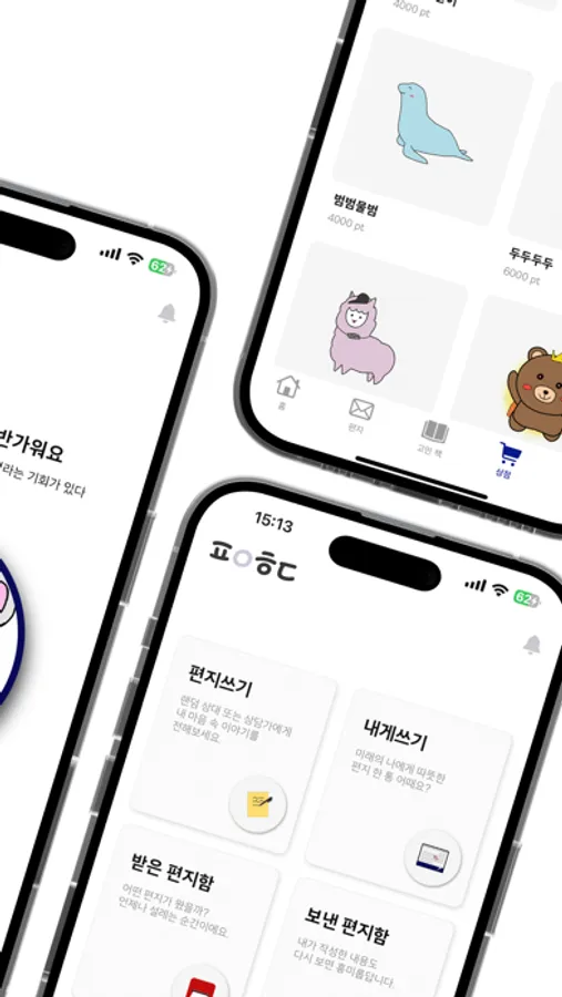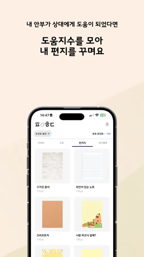 - 아이템 구매 : 아바타, 편지지, 우표, 편지봉투를 구매해 내 편지를 더 예쁘게 꾸며보세요.