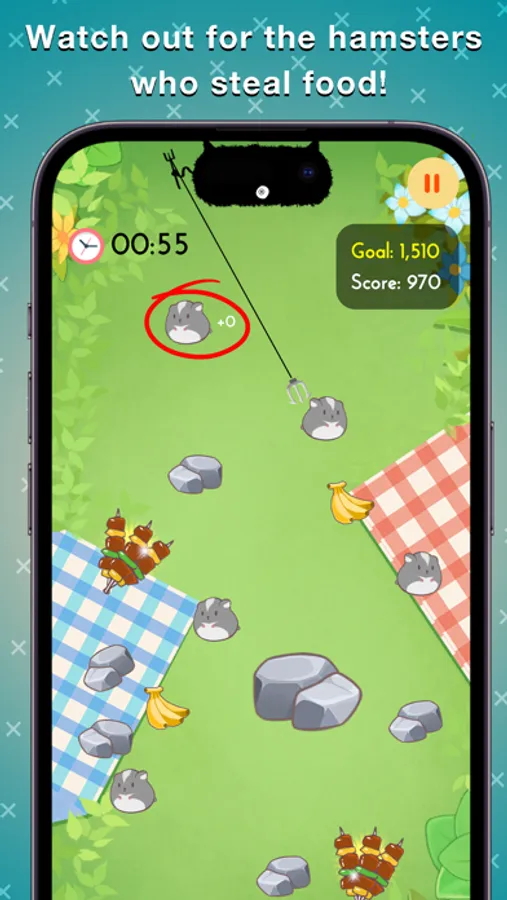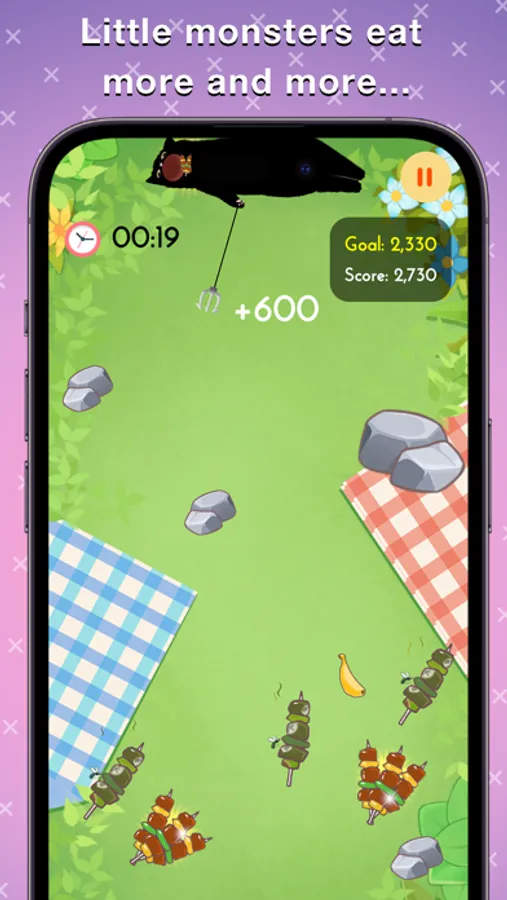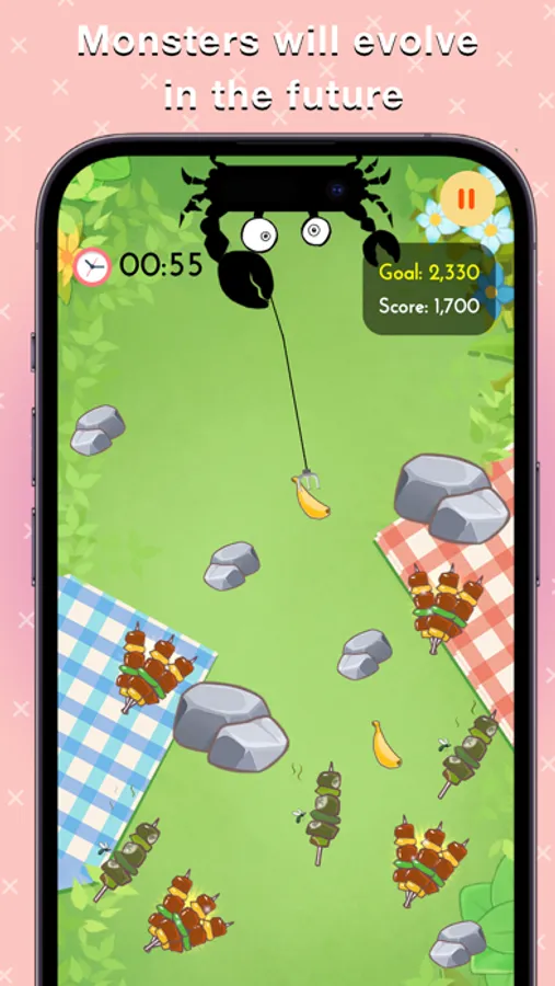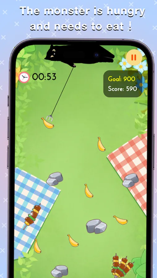 Classic casual game, tap the screen to release hook up delicious food for hungry monster.