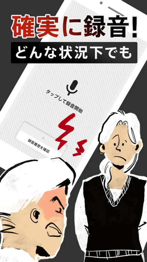 パワハラ・セクハラ・モラハラ、脅された時、犯罪に巻き込まれた時、どんなに緊迫した状況やパニック状態になっていても、起動して画面をワンタップするだけで録音できます。