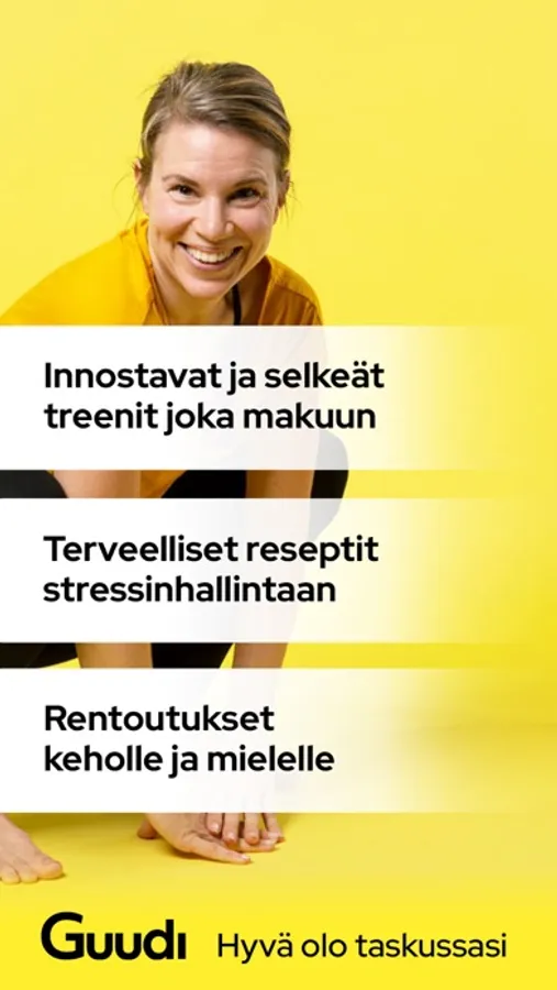 Voit ladata Guudin ilmaiseksi ja ilman rekisteröitymistä ja saat heti käyttöösi Guudin ilmaiset sisällöt. Rekisteröitymällä saat käyttöösi koko Guudin tukemaan pitkäkestoista ja pysyvää hyvinvointiasi!