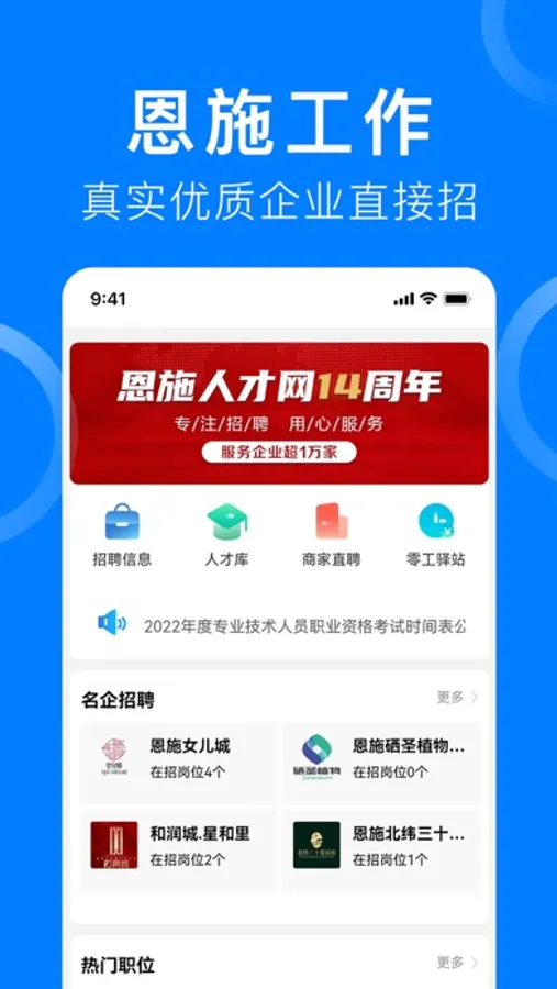 恩施恩才人力资源服务有限公司成立于2008年4月,是恩施一家综合性的人力资源服务机构,我司全资运营的人力资源服务平台——恩施人才网(www.enshijob.com),是恩施“线上+线下”O2O招聘模式的领先者,经过多年来的精耕细作,已经成为在恩施具有影响力的人才招聘网站之一。我司向企业提供包括网络招聘、大型招聘会、中高级人才洽谈会、企业管理培训、工商财税、知识产权、信息化建设、管理软件供应等一站式企业服务。凭借稳健的业绩和良好的口碑,恩施人才网已经跻身恩施招聘网站行业领先阵营,现实湖北省就业促进会会员单位、湖北省人力资源协会会员单位、恩施州电子商务协会副会长、恩施州网协副会长、恩施州创业导师单位等!