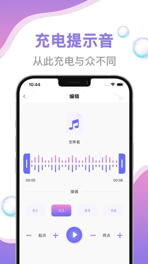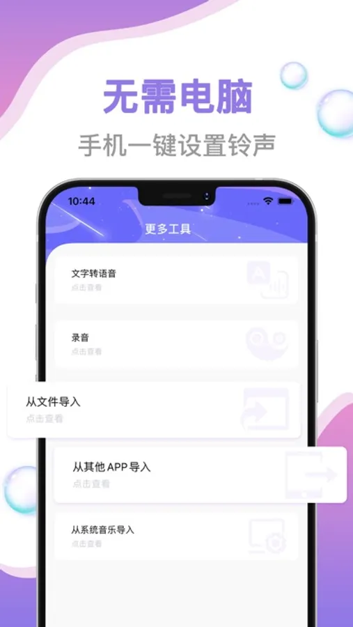 本应用不需要连接电脑,10秒快速设手机铃声,将手机里收藏的歌曲设置为铃声吧。