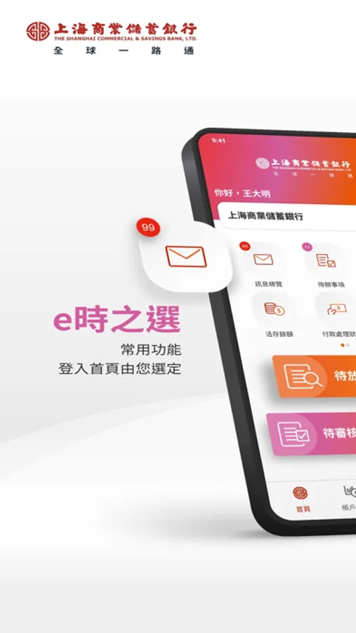 上海商業儲蓄銀行「全球一路通行動網」提供帳戶查詢、轉帳匯款交易、利匯率資訊查詢、服務據點查詢及指紋/人臉/圖形手勢快速登入與快速交易確認等線上服務,讓您隨時隨地掌舵全球脈動。