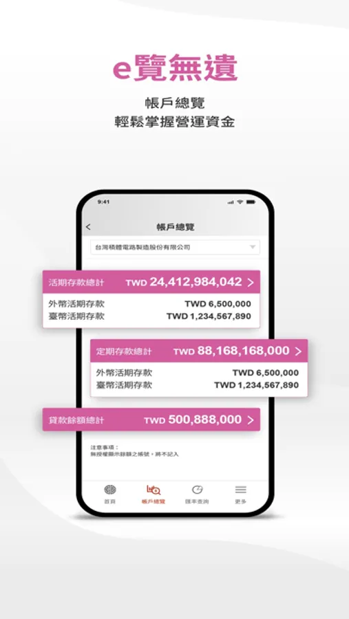 【帳戶總覽】隨觸隨查台外幣存放款餘額及交易明細,一指掌握資金動態。