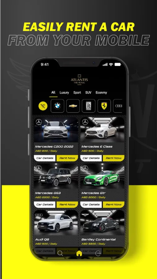 Explore a comprehensive list of luxury cars for rent in the UAE and pick the one that suits you best! Our inventory is selected from ideal models for you to enjoy every ride with utmost confidence. Download this app, scroll around hundreds of recommended car models, and get to know each one's power specifications, color, seats, interior, and exterior features in no time! With us, your dream car awaits at your fingertips.
