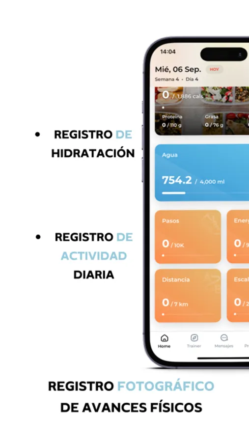 entrenamiento diario, registra tus comidas, actualiza tus registros, conectas tu