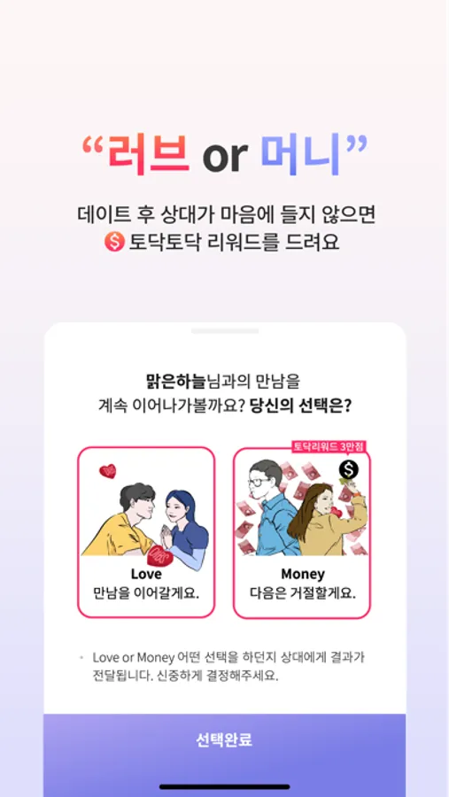수락한 소개팅 상대와 데이트 후 상대가 마음에 들지 않는다면, 속상한 마음을 위로하는 토닥토닥 리워드(현금 3만원 2023. 2월 기준)를 지급해드려요!