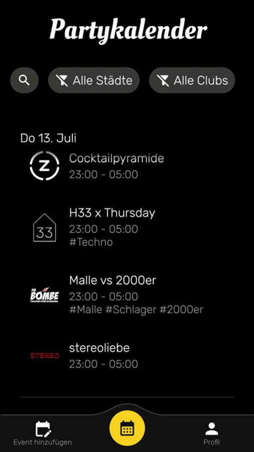 The Partykalender displays all the events of the nightclubs of Erlangen and Nuremberg.