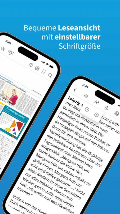 Lesen Sie bequem auf dem Smartphone Ihre Nachrichten und swipen Sie durch die Artikel Ihrer digitalen Zeitung. Besser Lesen: Tippen Sie auf einen Artikel und lesen Sie ihn bequem in der Leseansicht. Diese Ansicht mit integrierten Bilderstrecken ermöglicht ein leichtes Navigieren durch die Artikel. Die Schriftgröße können Sie wie gewohnt individuell anpassen.