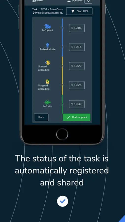 • The dispatcher is always aware of the status and activities of the mixer: Departure concrete plant with ETA yard, Arrival yard, Start of unloading, End of unloading, Departure wharf with ETA plant, ...