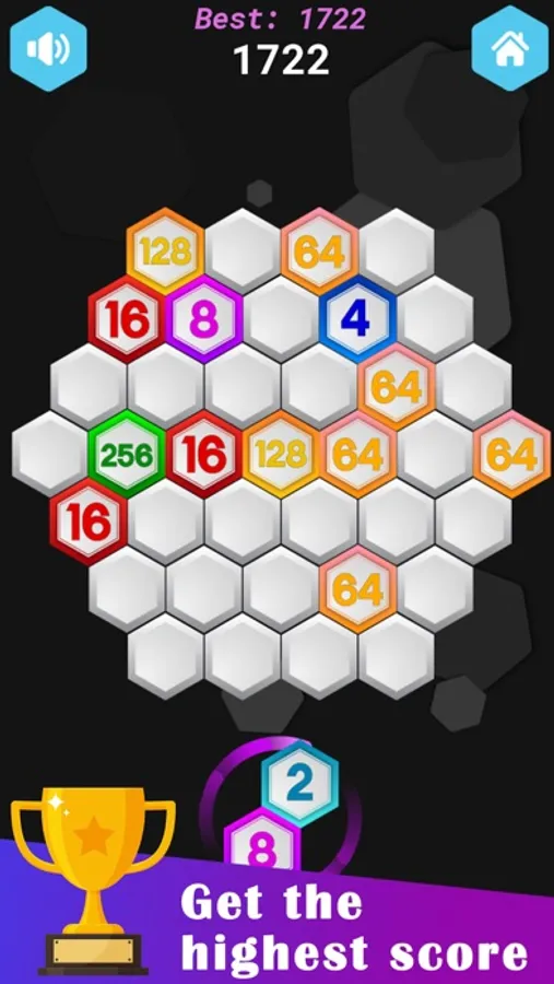 Show great strategy to place the hexa blocks in the best possible slots. Create merging combos in the hexagon to earn more points. Try to improve your best scores and top the leaderboard.
