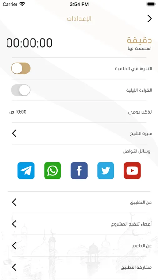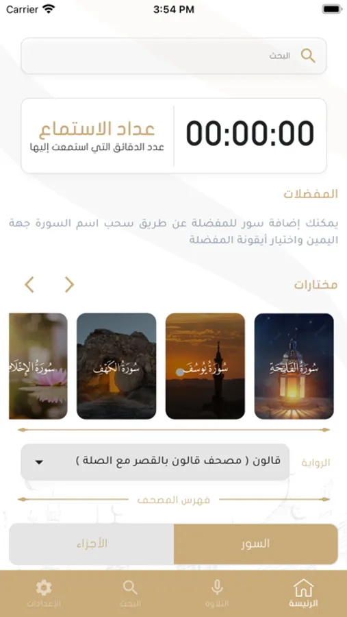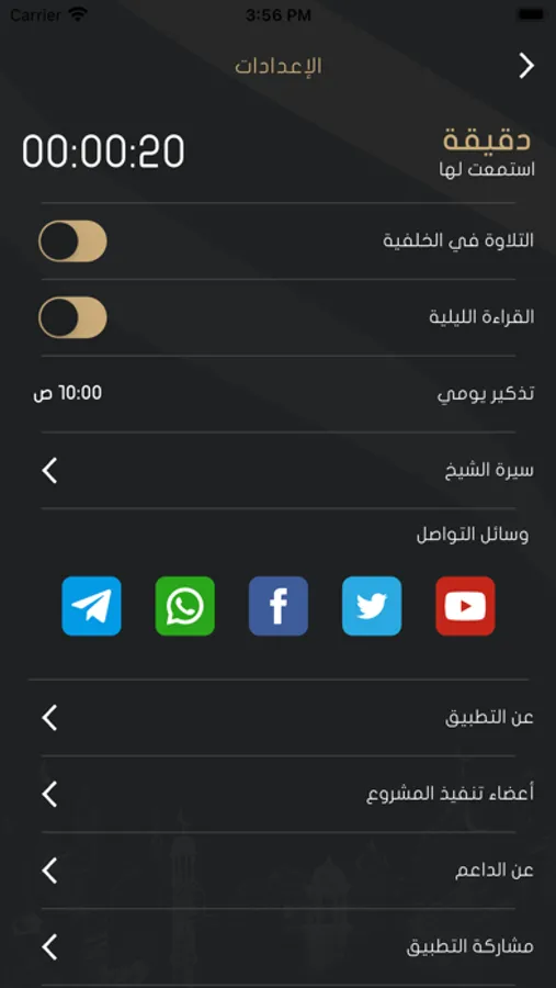 • عداد لمعرفة ساعات أو دقائق قضيتها في استماع القراءة المباركة.