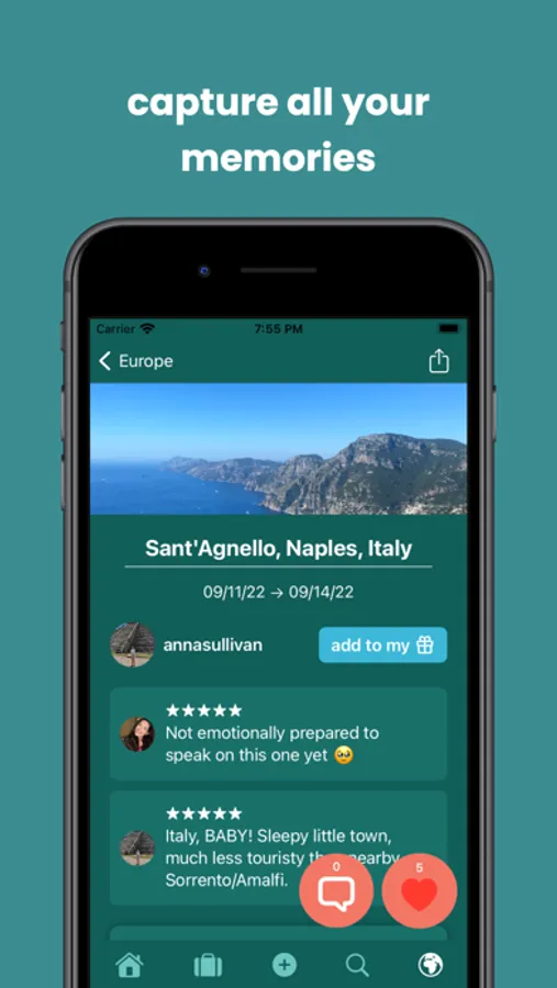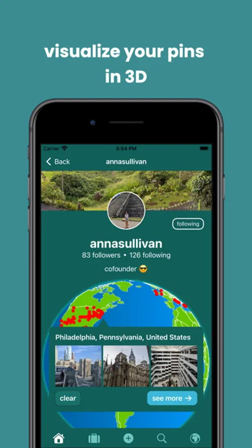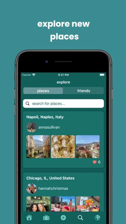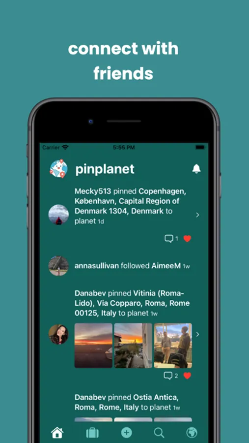 Your home feed is where you can see where your friends are pinning. We also include an explore page where you can find and follow new friends, and see where other users have pinned so far to inspire future travels.