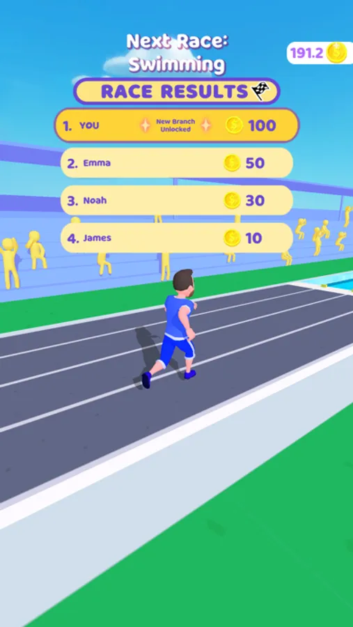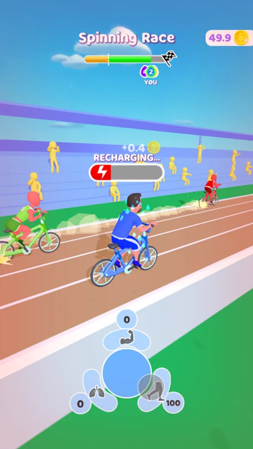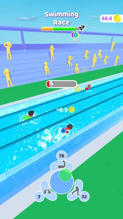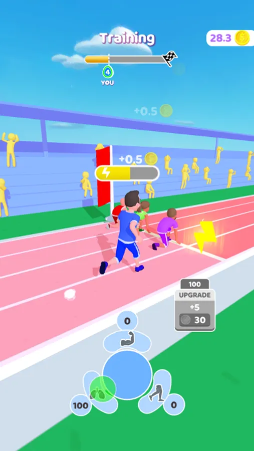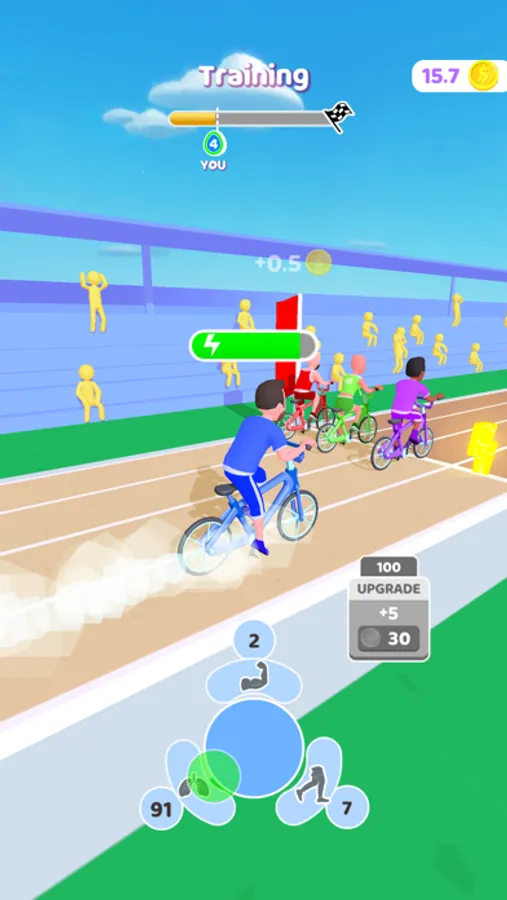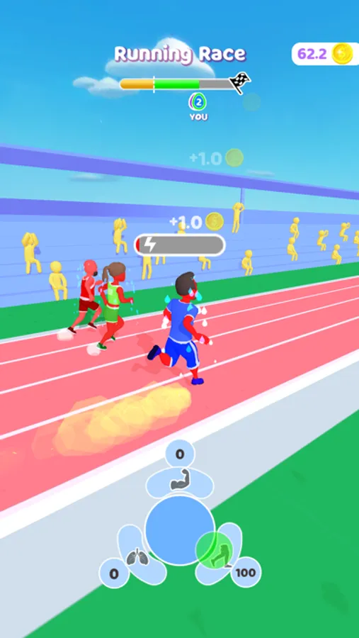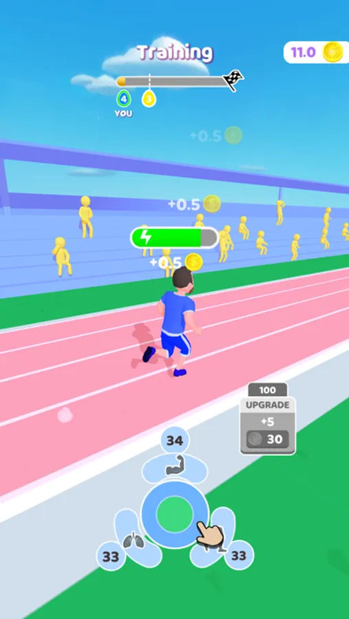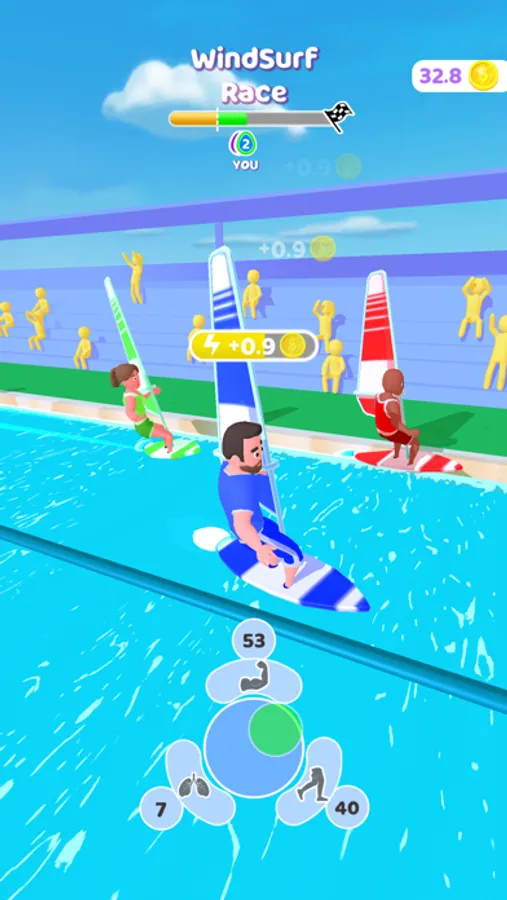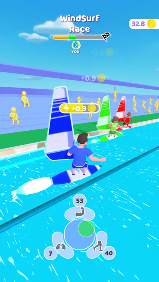 The limit is you! You should use your body parts wisely! You can use your legs to run or cycle faster but you should use both in order to swim or windsurf faster! Upgrade your total point by the money you earn during the race and at the end of the race!