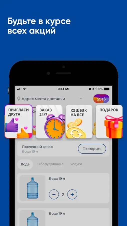 Скачайте приложение Чудесная водица на свой смартфон и делайте заказ воды 24/7. Вы сможете повторять заказ нажатием одной кнопки, видеть всю историю покупок и быть в курсе всех акций компании.