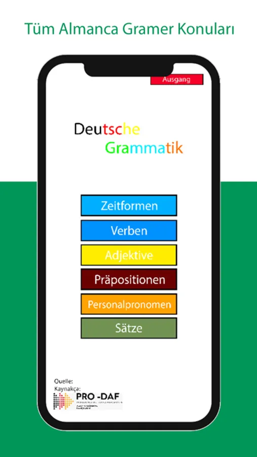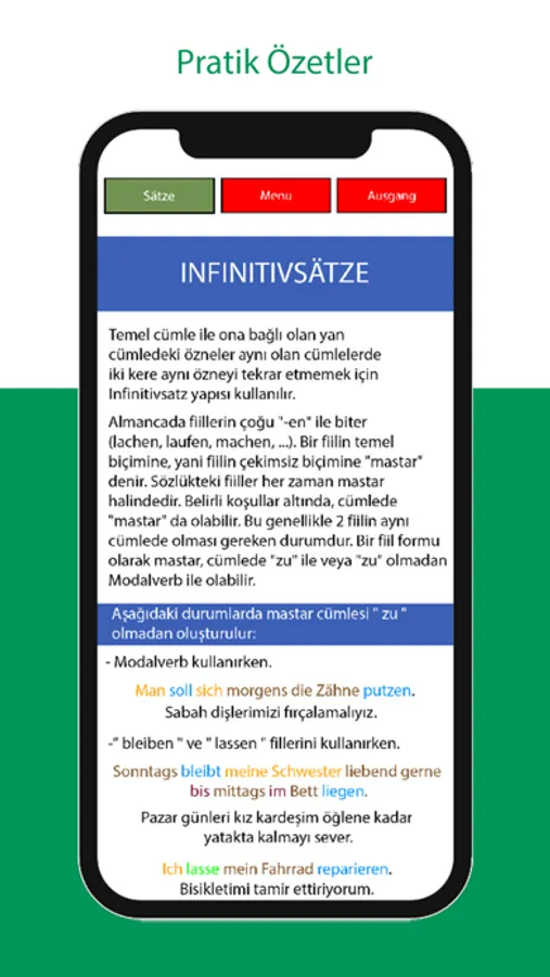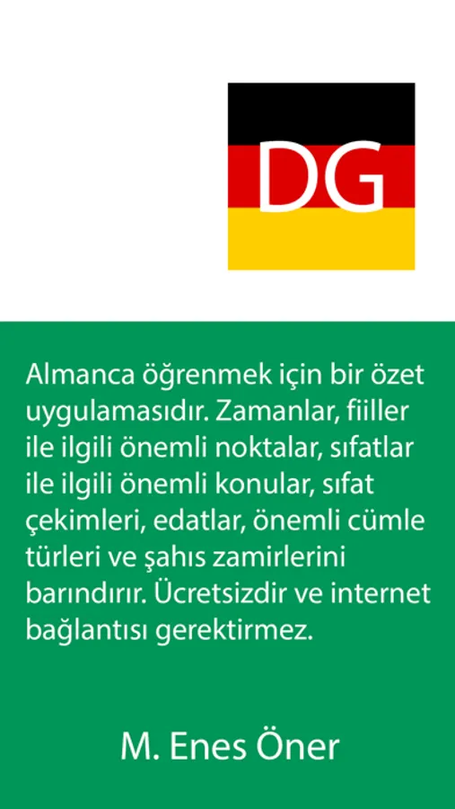 Almanca öğrenmek için bir özet uygulamasıdır. Zamanlar, fiiller ile ilgili önemli noktalar, sıfatlar ile ilgili önemli konular, sıfat çekimleri, edatlar, önemli cümle türleri ve şahıs zamirlerini barındırır. Ücretsizdir ve internet bağlantısı gerektirmez.