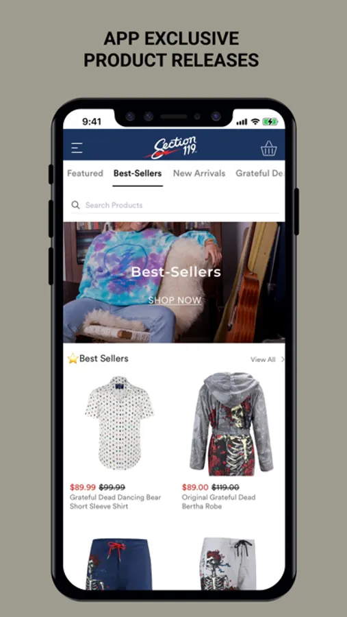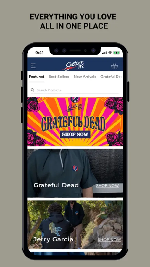 Section 119 is home to premium rock & roll merchandise. It's made for fans, by fans. Committed to filling customers' closets with music inspired apparel for both men and women. The assortment offers tops, bottoms and accessories from The Grateful Dead, Phish, David Bowie, Pink Floyd, Miles Davis, and The Beatles.