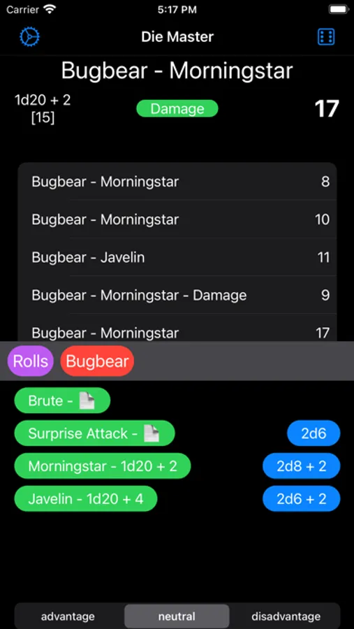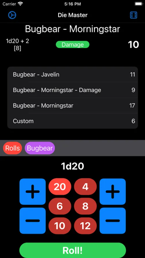 Die Master is a dice rolling app built with the Dungeon Master in mind. Beyond its basic dice rolling functions, it allows for the creation of monsters and their associated roll sets ahead of game play. Having these rolls at the tip of your fingers then allows for smoother game play. This application needn’t completely replace your beloved D20’s, but is a tool to speed up rolling during complicated combat encounters.