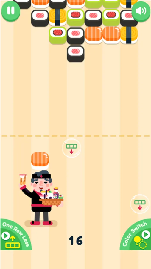 This is a Match 3 game sushi shooting. Try to be a sushi man, throw the sushi pieces up, when the sushi pieces are stacked with 3 or more pieces of the same color, you win.