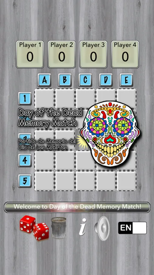 Day of the Dead Memory Match is a game for 2 to 4 players or teams. The object is to remember the positions of 12 different Day of the Dead images and their matches. Players take turns and tap any of the hidden cards to reveal an image. One point is earned for each match. The winner is the player or team with the most points after all the matches have been made.